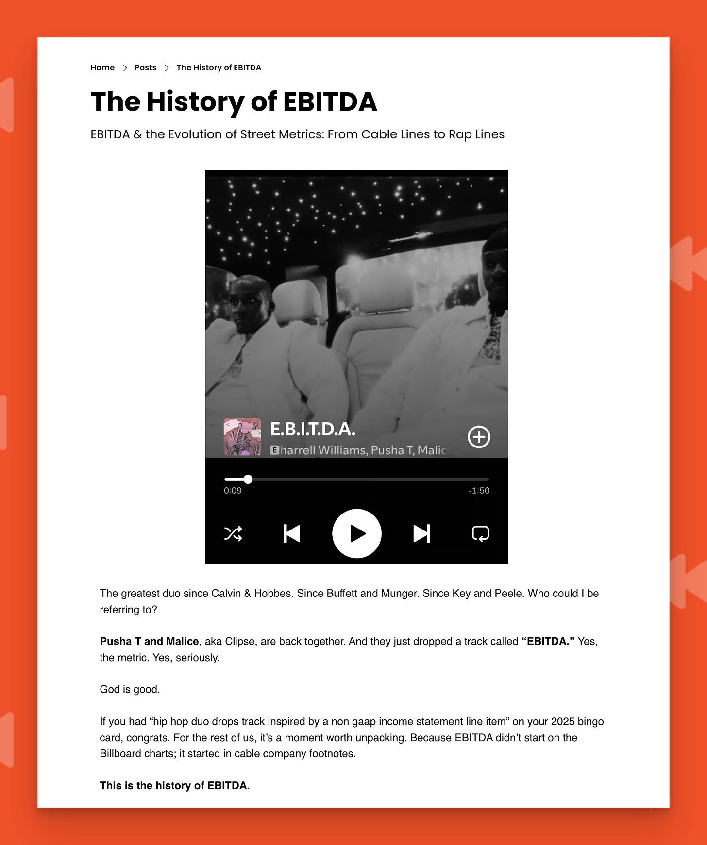 The first image in the post is a screenshot of a Pharrell Williams song on Spotify, aptly titled “EBITDA.”